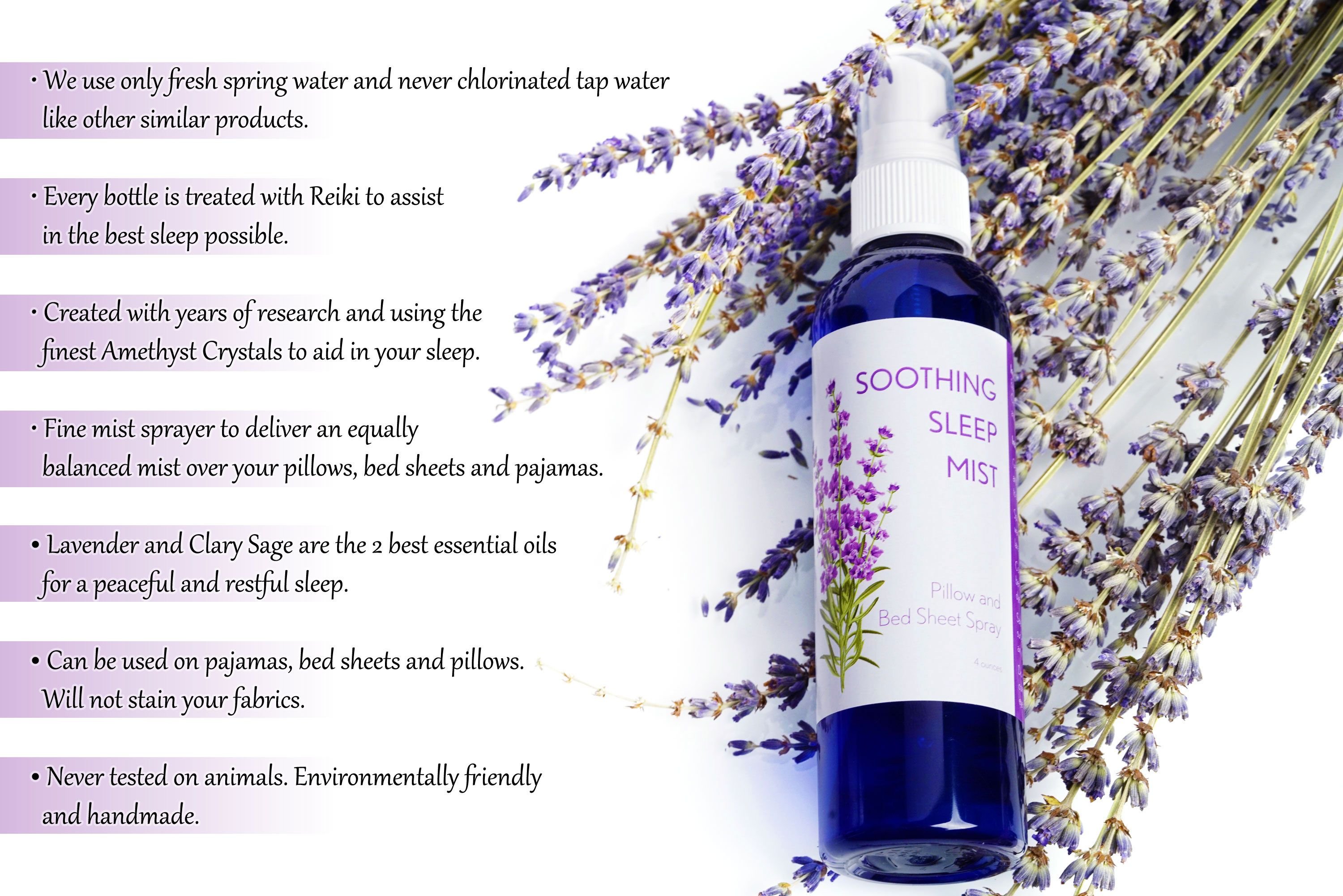 8 ounce spray mister. Designed for better sleep; our Soothing Sleep Mist is hand-crafted in the United States with 100% pure ORGANIC essential oils of Lavender and COMPLIMENTING ESSENTIAL OILS; Amethyst Crystals and Reiki charged. Carefully formulated to ensure you get the best sleep possible. These oils and Amethyst crystals are well known for their calming effect; ability to promote restful sleep and alleviating anxiety and stress. See how sleep can be effortless and easy once again with our Soothing Sleep Mist! PLEASE NOTE WE ONLY USE ORGANIC ESSENTIAL OILS. WE ONLY USE PURE UNTREATED NATURAL SPRING WATER; NOT CITY CHLORINATED TAP WATER AS DO MOST OTHER COMPETITORS. (cap color may vary)