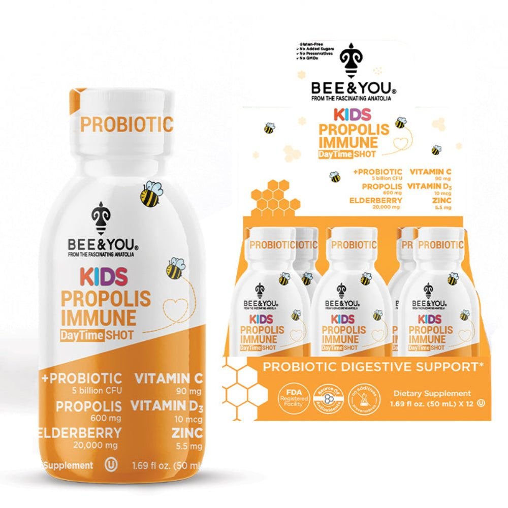 BEE&YOU Kids Propolis Immune Day Time Shot: Specially formulated with Anatolian propolis ( A.P.E), Vitamin D3, Probiotic 5 billion CFU (Lactobacillus rhamnosus), Vitamin C, and zinc.